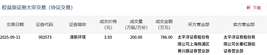 9月11日,清新環(huán)境大宗交易成交200萬股,成交額786萬元,占當(dāng)日總成交額的12.98%,成交價(jià)3.93元,較市場(chǎng)收盤價(jià)4.08元折價(jià)3.68%。