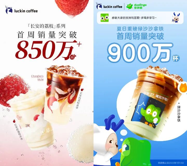 比較有代表性的品牌如瑞幸,一方面將聯(lián)名節(jié)奏與產(chǎn)品研發(fā)上新頻率配合,另一方面逐漸探索出產(chǎn)能置換模式:通過產(chǎn)品帶來的確定性的銷量與曝光量,抵消部分營銷成本。其暑期與《長安的荔枝》聯(lián)名產(chǎn)品首周銷量850萬、與多鄰國的聯(lián)名產(chǎn)品首周即售出900萬杯,印證了其底氣。同時,瑞幸將“線條小狗”、“黃油小熊”等經(jīng)市場驗證的IP,通過定期回歸維持消費期待,將短期聯(lián)名轉(zhuǎn)化為長期資產(chǎn)。