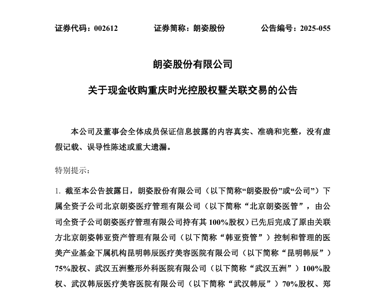 近日,朗姿股份有限公司(下稱:朗姿股份)發(fā)布公告稱,公司下屬全資子公司北京朗姿醫(yī)療管理有限公司(下稱:北京朗姿醫(yī)管)擬以9247.5萬元現(xiàn)金收購(gòu)重慶米蘭柏羽時(shí)光整形美容醫(yī)院有限公司(下稱:重慶時(shí)光)67.50%的控股權(quán)。