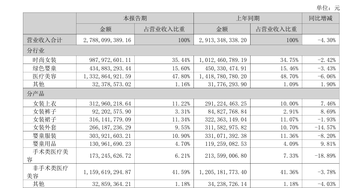 但到2024年,公司增長(zhǎng)明顯放緩,最大業(yè)務(wù)醫(yī)療美容營(yíng)收為27.84億元,同比僅微增3.47%,更是三大板塊中唯一保持正增長(zhǎng)的業(yè)務(wù)。進(jìn)入2025年上半年,三大業(yè)務(wù)均出現(xiàn)負(fù)增長(zhǎng),其中最大醫(yī)美業(yè)務(wù)同比下滑6.06%,跌幅居首。