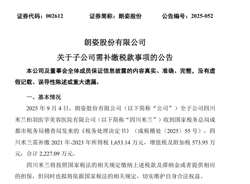 此外,朗姿股份核心收入來源醫(yī)療美容業(yè)務(wù)亦面臨運(yùn)營(yíng)管理問題。今年9月4日,朗姿股份發(fā)布公告稱其全資子公司四川米蘭柏羽醫(yī)學(xué)美容醫(yī)院收到國(guó)家稅務(wù)總局成都市稅務(wù)局稽查局發(fā)出的《稅務(wù)處理決定書》,要求補(bǔ)繳2021年至2023年期間所得稅、增值稅及附加稅合計(jì)2227.09萬元。