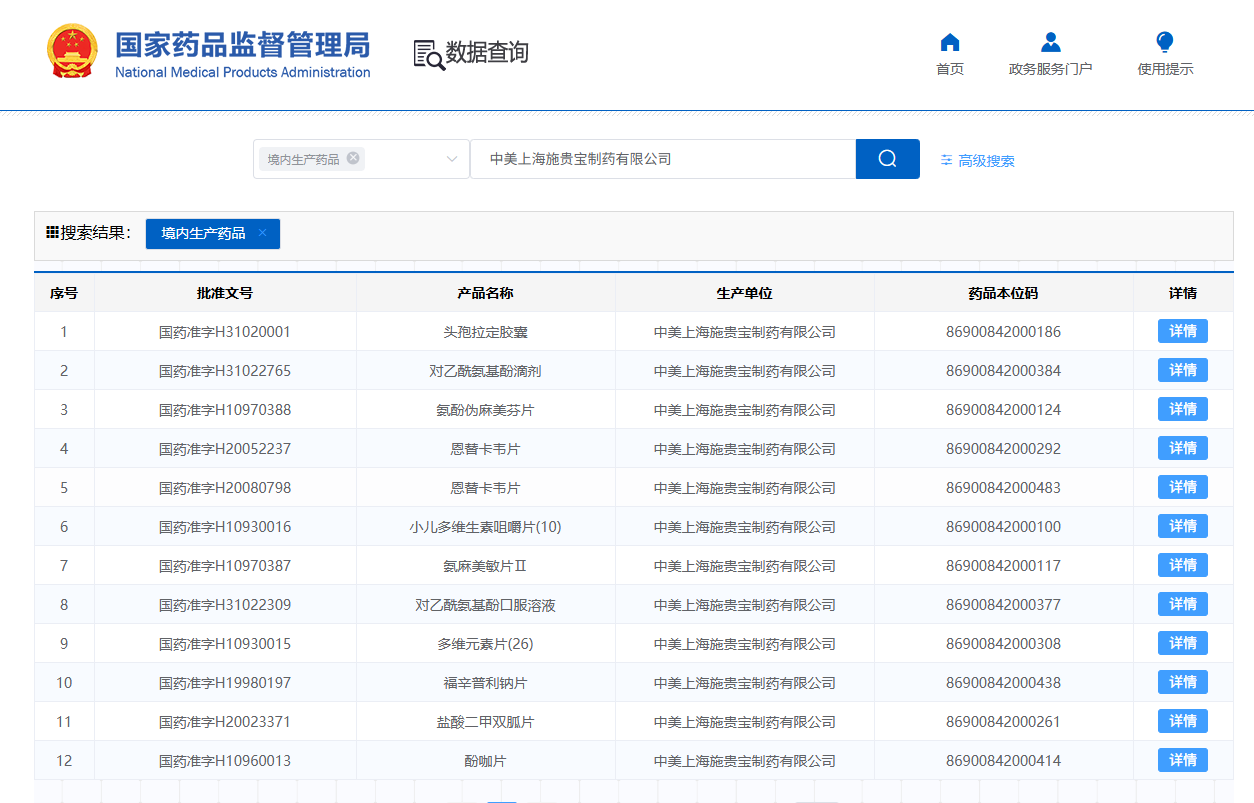 據(jù)國(guó)家藥監(jiān)局,中美上海施貴寶制藥有限公司(簡(jiǎn)稱“中美上海施貴寶”)擁有頭孢拉定膠囊、對(duì)乙酰氨基酚滴劑、氨酚偽麻美芬片、恩替卡韋片、小兒多維生素咀嚼片(10)、多維元素片(26)、氨麻美敏片Ⅱ、對(duì)乙酰氨基酚口服溶液、福辛普利鈉片、鹽酸二甲雙胍片等。