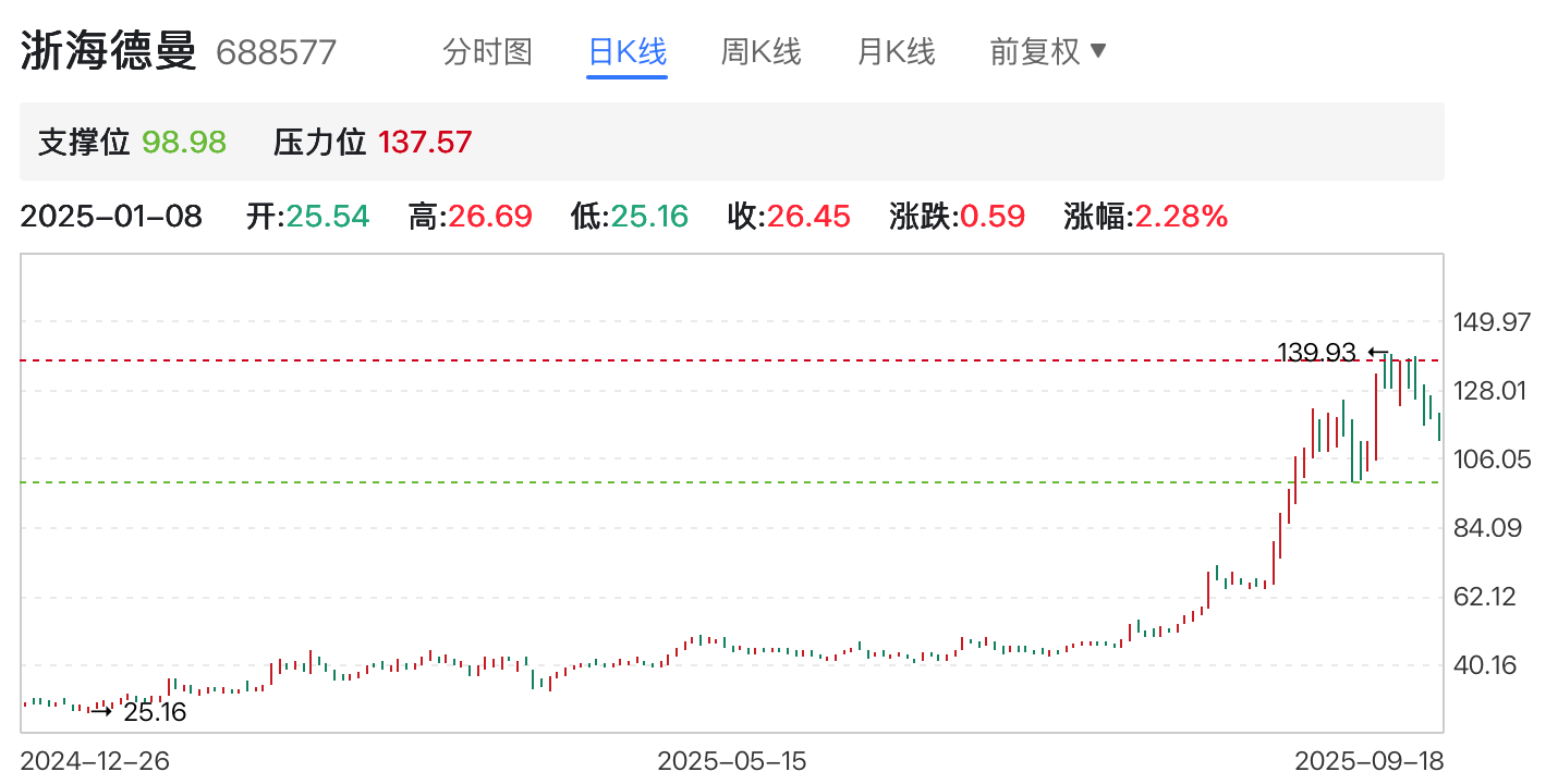 若以今年1月8日的25.16元/股歷史低點為參照,至9月10日的最高點139.93元/股,浙海徳曼年內股價累計漲幅達456.16%。