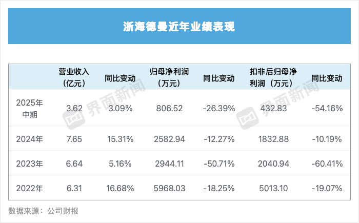 界面新聞統(tǒng)計發(fā)現(xiàn),浙海徳曼歸母凈利潤連續(xù)三年呈下滑態(tài)勢。2022-2024年,其歸母凈利潤分別為5968.03萬元、2944.11萬元、2582.94萬元,同比分別下滑18.25%、50.71%、12.27%;扣非后歸母凈利潤分別為5013.10萬元、2040.94萬元、1832.88萬元,同比分別下滑19.07%、60.41%、10.19%。