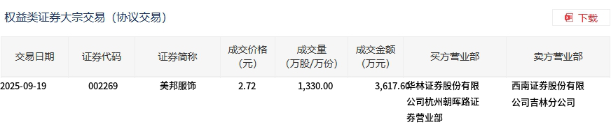 美邦服飾今日大宗交易平價成交1330萬股,成交額3617.6萬元
