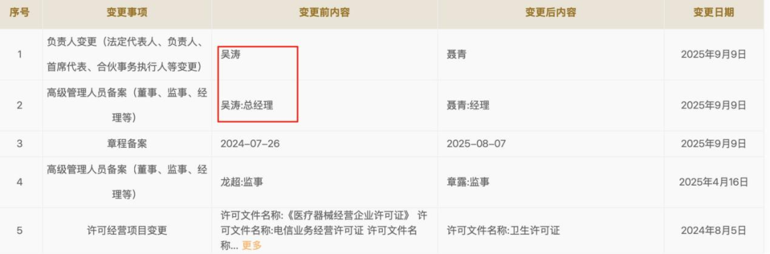 近日,青眼通過國(guó)家企業(yè)信用信息公示系統(tǒng)了解到,妍麗主要人員信息近兩年來發(fā)生了多次變更。其中,最大的變化莫過于吳濤的退出。例如,2025年9月9日,妍麗法定代表人和高級(jí)管理人員備案(董事、監(jiān)事、經(jīng)理等)均由吳濤變更為聶青。