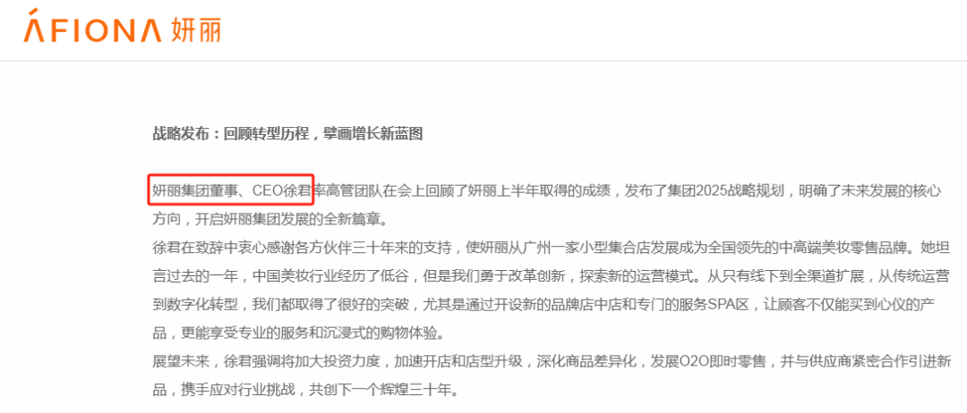 青眼注意到,早在2024年4月,徐君就已擔(dān)任妍麗董事。今年5月,運(yùn)營(yíng)主體為妍麗的“妍麗文化”公眾號(hào)曾發(fā)文提及到,集團(tuán)董事、CEO Jane出席妍麗2025年全國(guó)店長(zhǎng)大會(huì)并發(fā)表致辭。這,疑似是徐君首次亮相妍麗的官方活動(dòng)。