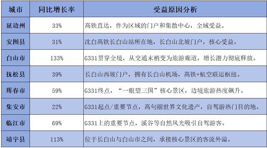 攜程數(shù)據(jù)顯示,吉林省國慶期間訂單,同比增長近200%。后期增幅尤為驚人:從10月4日開始,同比增長率均超過 200%,其中10月6日的增幅甚至接近 600%。位于沈白高鐵和G331沿線的吉林省大小城市,特別是大長白山區(qū)域和邊境地區(qū)增幅遠超傳統(tǒng)中心城市,例如: