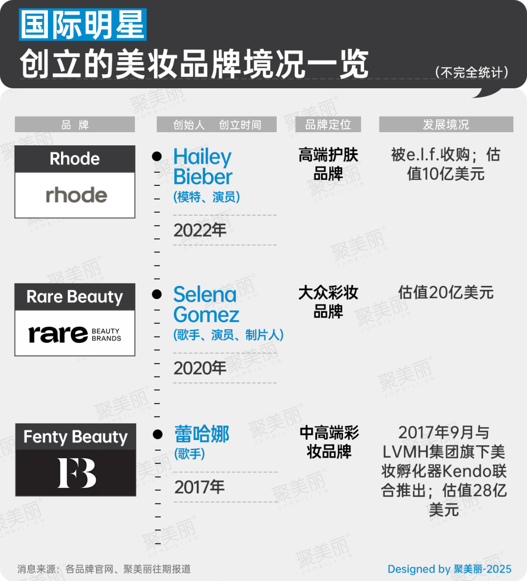 類似的合作邏輯也體現(xiàn)在蕾哈娜、上美股份,以及彩棠(明星創(chuàng)始人與專業(yè)團隊協(xié)作)的品牌打造中。相比明星單獨操盤品牌(需承擔供應鏈、運營、合規(guī)等多重高風險),與成熟企業(yè)合作能直接依托集團已有的資源儲備(如供應鏈、研發(fā)、渠道),補齊明星在商業(yè)運營能力上的短板,從而降低品牌從0到1的啟動風險與試錯成本。
