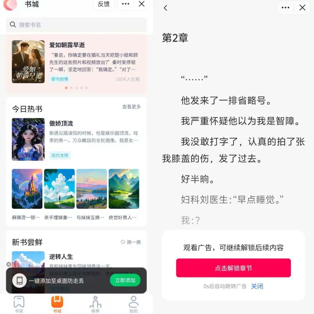 不過,字節(jié)短故事小程序的變現(xiàn)模式仍以廣告為主。Tech星球體驗(yàn)后發(fā)現(xiàn),用戶閱讀時(shí),不僅解鎖后續(xù)章節(jié)需要觀看30秒廣告,即便停留在當(dāng)前閱讀界面,每隔幾秒鐘也會自動(dòng)彈出一段全屏視頻廣告,廣告彈出時(shí)會打斷閱讀進(jìn)度,需要手動(dòng)關(guān)閉才能繼續(xù)看書,頻繁的廣告干擾很容易讓讀者失去耐心,尤其對喜歡沉浸式閱讀的用戶來說,體驗(yàn)大打折扣。