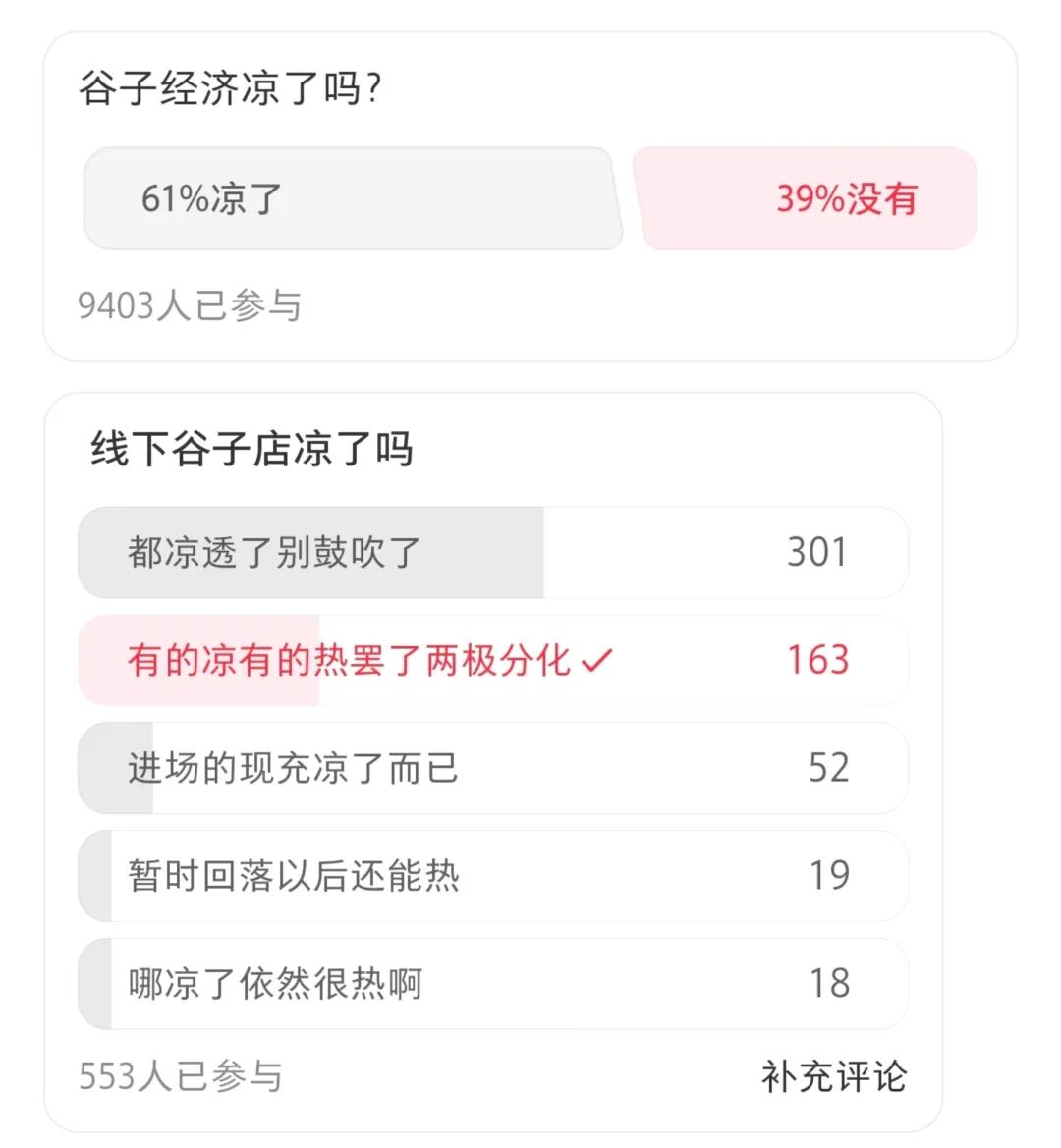 市場的信心更是低迷:小紅書一份近萬人參與的投票中,超61%的用戶認(rèn)為“谷子經(jīng)濟(jì)涼了”;雷報(bào)發(fā)起的調(diào)查中,則有超54%的用戶認(rèn)為“線下谷店都涼透了,別鼓吹了”。事實(shí)真的是這樣嗎?谷子經(jīng)濟(jì)真的就此跌下“神壇”,成為短暫狂歡后的黃粱一夢嗎?