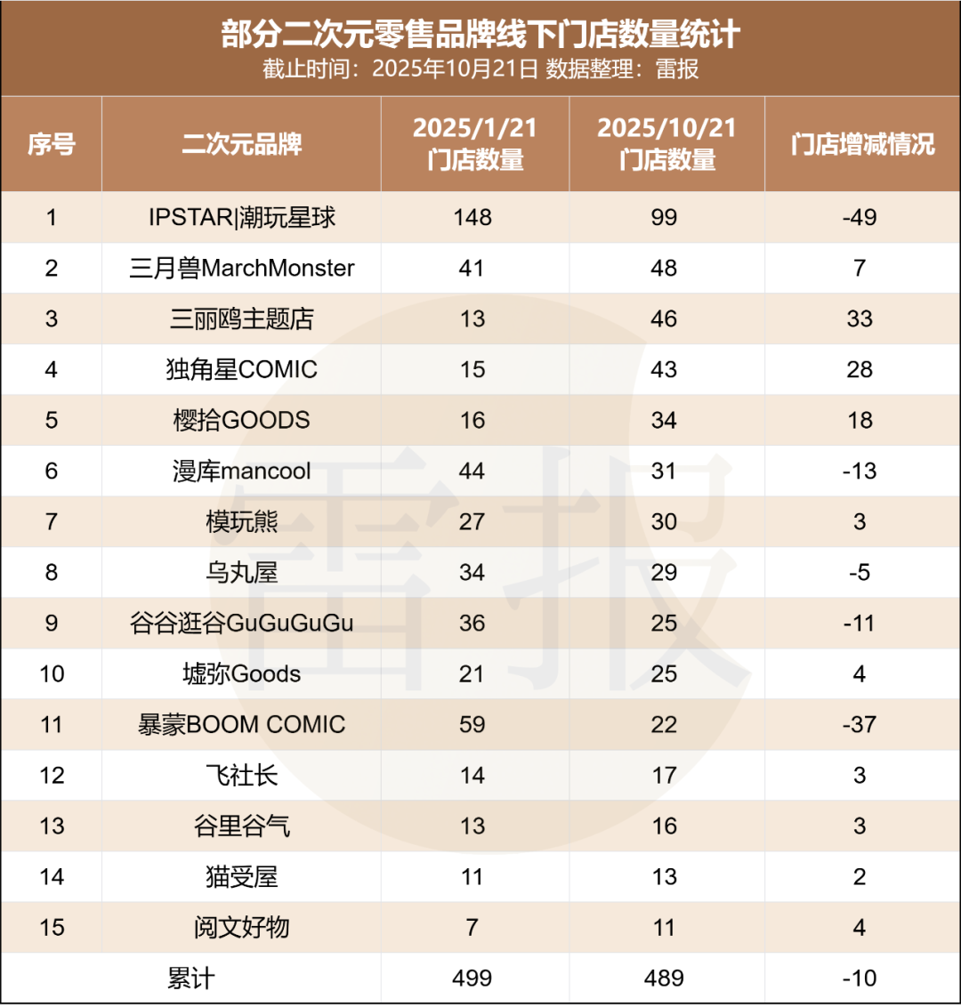 重點(diǎn)二次元品牌方面,雷報(bào)統(tǒng)計(jì)了15家不同類型二次元連鎖品牌的年內(nèi)門店變更情況發(fā)現(xiàn):盡管潮玩星球、暴蒙等品牌門店數(shù)量減少,但15家品牌中實(shí)現(xiàn)門店增長的仍達(dá)10家之多,其中三麗鷗主題店、獨(dú)角星COMIC、櫻拾GOODS的門店增量尤為可觀。
