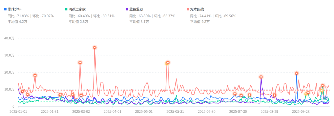 而“小周期”則對應(yīng)短期市場波動(dòng)。谷子的核心價(jià)值深度綁定上游IP資源,當(dāng)上游內(nèi)容端同時(shí)迸發(fā)多個(gè)大熱IP時(shí),下游衍生端也往往會迎來熱賣期。例如,去年的谷子熱正得益于“咒術(shù)回戰(zhàn)”“排球少年”“藍(lán)色監(jiān)獄”“間諜過家家”等一眾熱門日漫IP的爆發(fā)。而今年,相關(guān)經(jīng)典IP的熱度下滑明顯。巨量算數(shù)的關(guān)鍵詞搜索指數(shù)就顯示,上述四大IP今年的指數(shù)數(shù)值均同比減少了6-7成。