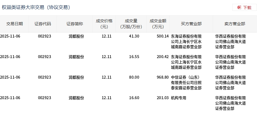 11月6日,潤都股份大宗交易成交154.45萬股,成交額1870.39萬元,占當日總成交額的26.95%,成交價12.11元,較市場收盤價13.3元折價8.95%。