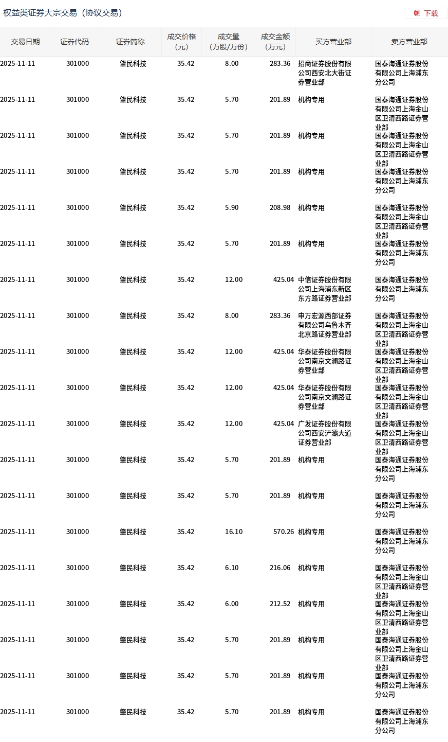 11月11日,肇民科技大宗交易成交149.4萬股,成交額5291.71萬元,占當日總成交額的18.76%,成交價35.42元,較市場收盤價42.05元折價15.77%。