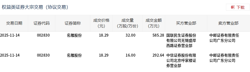 11月14日,名雕股份大宗交易成交48萬股,成交額877.92萬元,占當(dāng)日總成交額的6.57%,成交價(jià)18.29元,較市場(chǎng)收盤價(jià)18.57元折價(jià)1.51%。