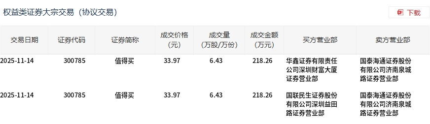 11月14日,值得買大宗交易成交12.86萬股,成交額436.52萬元,占當日總成交額的0.24%,成交價33.97元,較市場收盤價38.8元折價12.45%。