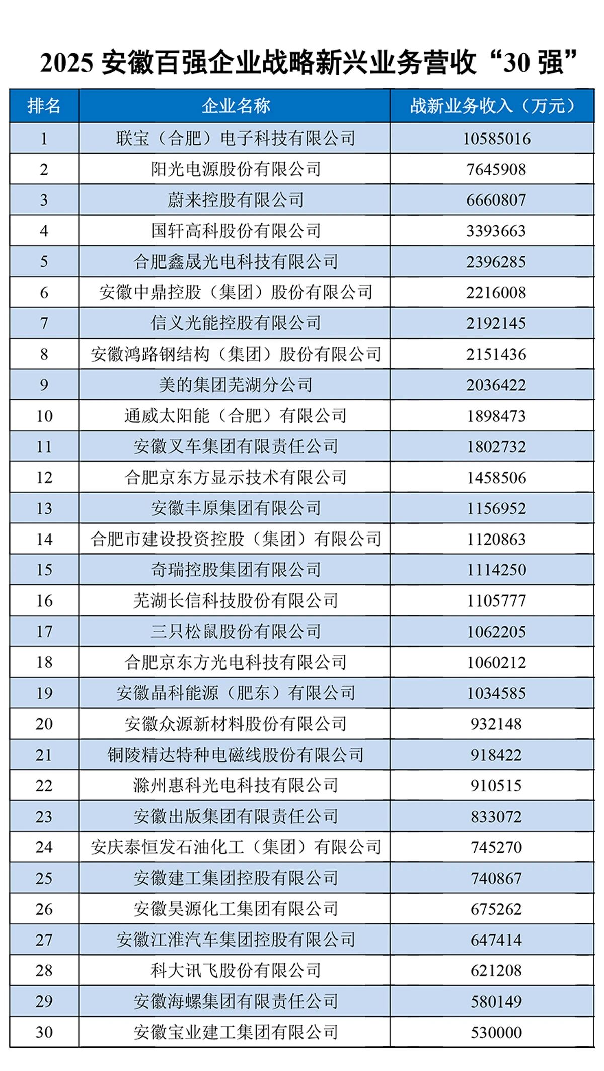 安徽省交通控股集團(tuán)有限公司、合肥百貨大樓集團(tuán)股份有限公司、中國石化銷售股份有限公司安徽石油分公司分別位居2025安徽服務(wù)業(yè)百強企業(yè)榜前三位。今年還特別評選了2025安徽百強企業(yè)戰(zhàn)略新興業(yè)務(wù)營收“30強”,聯(lián)寶(合肥)電子科技有限公司以1058.5億元的戰(zhàn)略新興業(yè)務(wù)收入排名榜首。