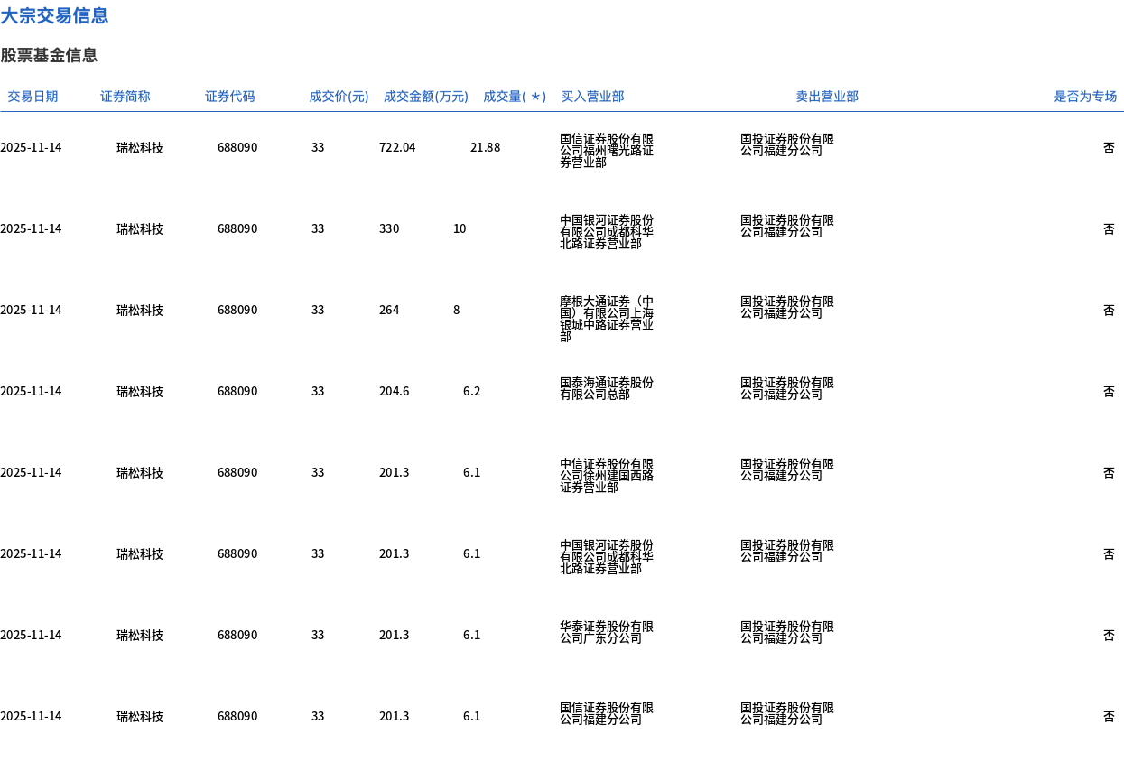 11月14日,瑞松科技大宗交易成交70.48萬股,成交額2325.84萬元,占當(dāng)日總成交額的7.82%,成交價(jià)33元,較市場(chǎng)收盤價(jià)39.78元折價(jià)17.04%。