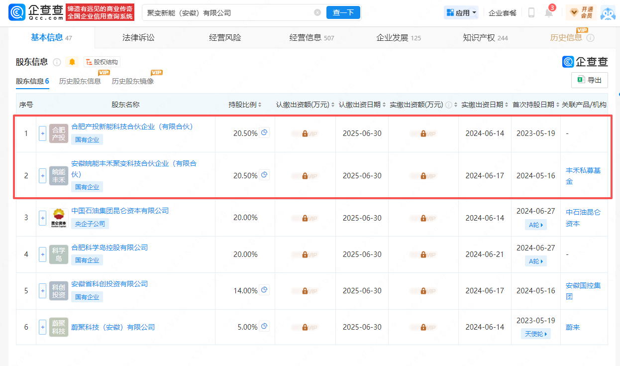 其中,合肥產(chǎn)投新能科技合伙企業(yè)(有限合伙)和安徽皖能豐禾聚變科技合伙企業(yè)(有限合伙)持股比例最多,均為20.50%。
