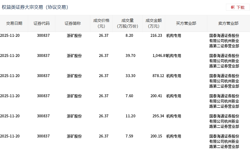 11月20日,浙礦股份大宗交易成交107.59萬股,成交額2837.14萬元,占當日總成交額的13.62%,成交價26.37元,較市場收盤價29.7元折價11.21%。
