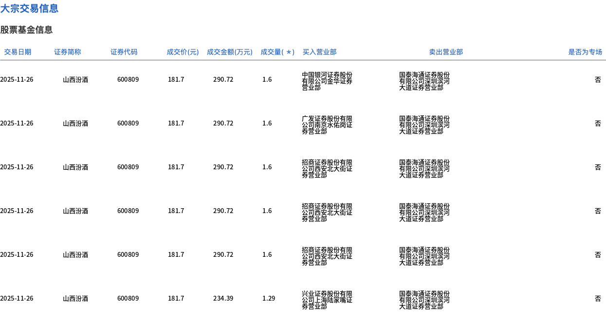 11月26日,山西汾酒大宗交易成交9.29萬股,成交額1687.99萬元,占當(dāng)日總成交額的3.34%,成交價181.7元,較市場收盤價193.3元折價6%。