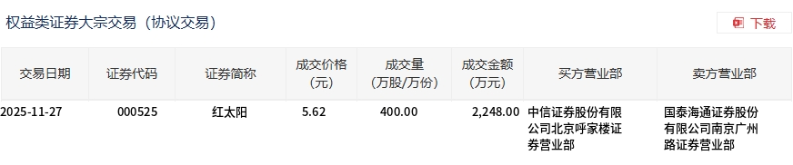 11月27日,紅太陽大宗交易成交400萬股,成交額2248萬元,占當(dāng)日總成交額的19.65%,成交價(jià)5.62元,較市場收盤價(jià)5.73元折價(jià)1.92%。