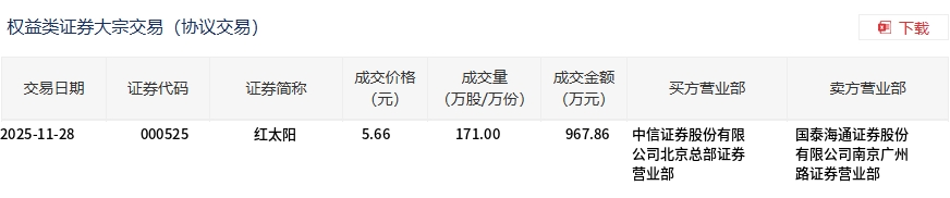 11月28日,紅太陽(yáng)大宗交易成交171萬(wàn)股,成交額967.86萬(wàn)元,占當(dāng)日總成交額的6.63%,成交價(jià)5.66元,較市場(chǎng)收盤價(jià)5.78元折價(jià)2.08%。