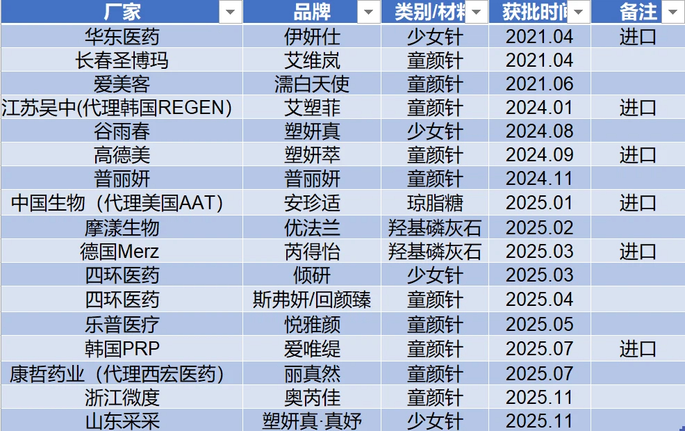 近兩年,童顏針的下證速度明顯加快,截至今年11月末,國(guó)內(nèi)已有10款童顏針、4款少女針獲批。另外,瓊脂糖、羥基磷灰石等新材料醫(yī)美注射劑也開(kāi)始拿證。