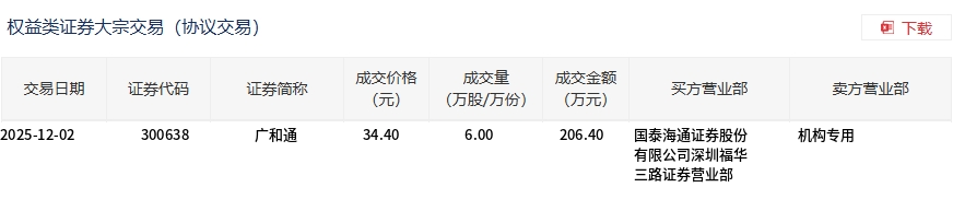 12月2日,廣和通大宗交易成交6萬股,成交額206.4萬元,占當(dāng)日總成交額的0.03%,成交價34.4元,較市場收盤價34.4元持平。