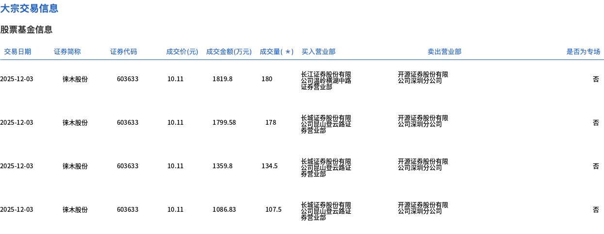 12月3日,徠木股份大宗交易成交600萬股,成交額6066.01萬元,占當(dāng)日總成交額的32.52%,成交價10.11元,較市場收盤價10.97元折價7.84%。