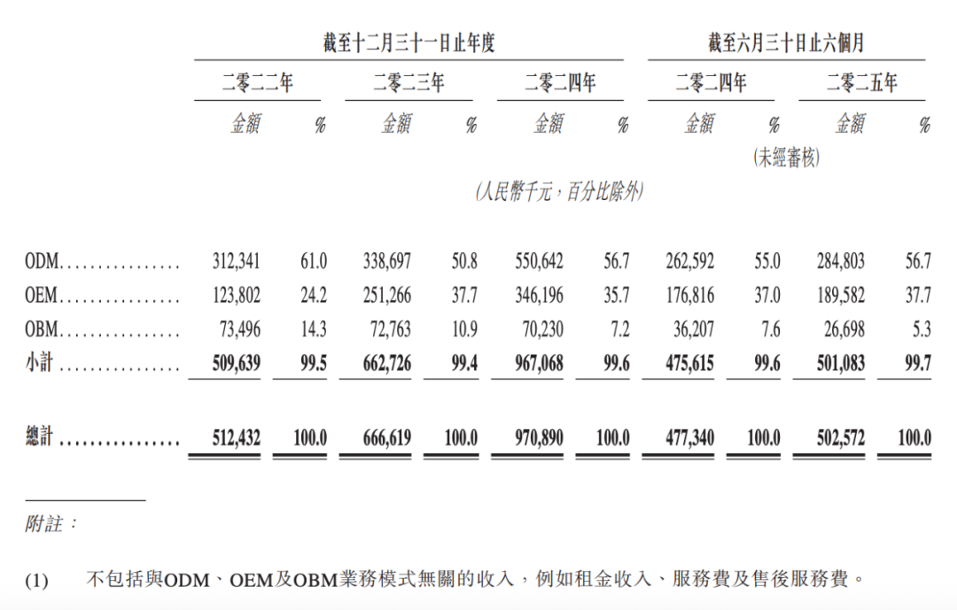 不過招股書披露,中堅科技的代工模式,包括ODM和OEM合計貢獻公司營收占比超過了9成。在2022年至2025年上半年(以下簡稱“報告期內”),ODM和OEM的營收合計占比分別為85.2%、88.5%、92.4%及94.4%。