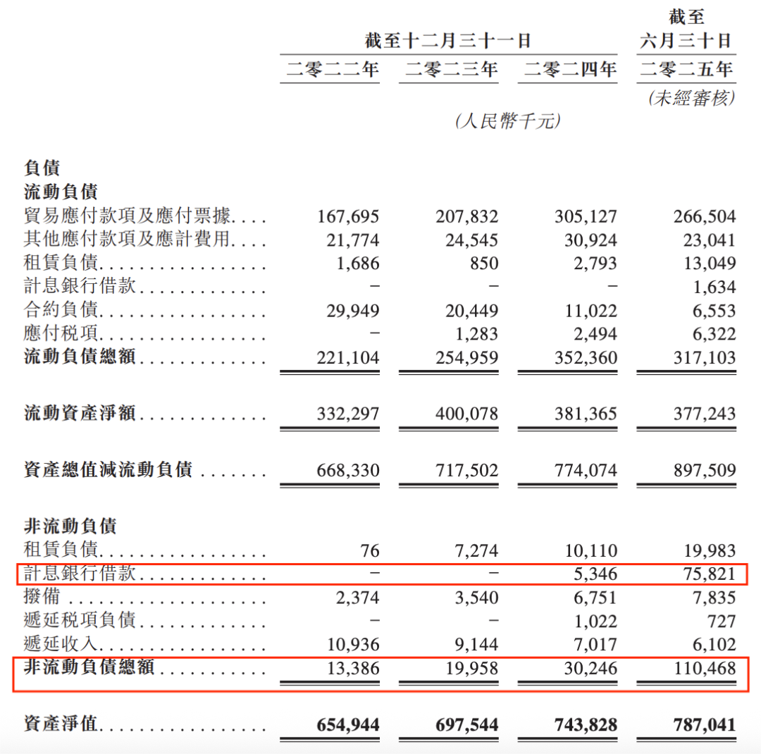 其中主要是計息銀行借款在增長,從2024年末的534.6萬元增至2025年上半年末的7582.1萬元。