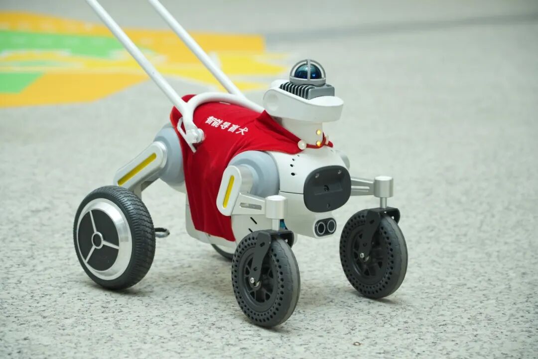 深圳地鐵黃木崗交通樞紐內(nèi),一臺外形酷似小狗的智能導(dǎo)盲犬,正牽引著一位視障人士平穩(wěn)穿過通道,前往目標服務(wù)點。它通過背部的扶手與使用者連接,以四輪行進,在遇到轉(zhuǎn)彎、障礙或懸空邊緣時,會及時發(fā)出語音提示并主動避障。視障乘客只需通過口頭指令,便能喚醒其路徑規(guī)劃、精準導(dǎo)航、智能避障、盲道跟隨、視覺識別與語音交互等一系列功能。