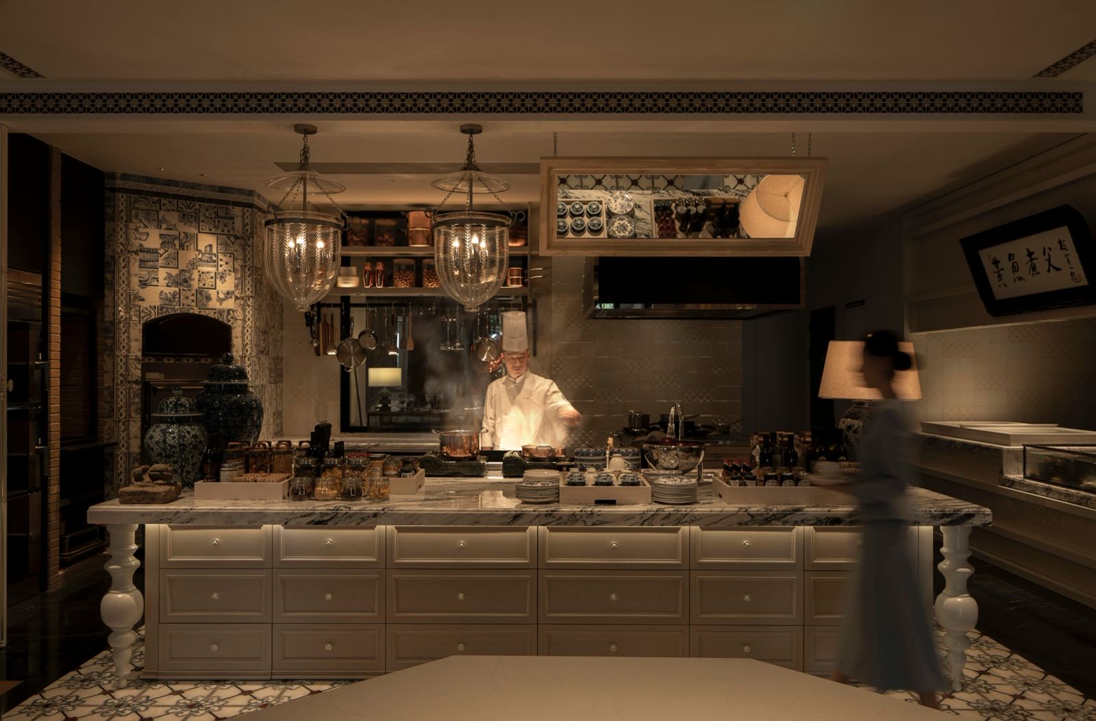 以青花瓷為主線,將“文明互鑒”作為空間核心理念,追溯青花瓷跨越數(shù)百年的世界旅程,讓中西美學(xué)、歷史與生活方式融合于同一空間。一層延續(xù)開放的社交氛圍,與戶外地中海式的松弛與明亮自然呼應(yīng),而KAIKI器會(日料區(qū))以檜木、竹影與庭院光影呈現(xiàn)靜雅東方意境。