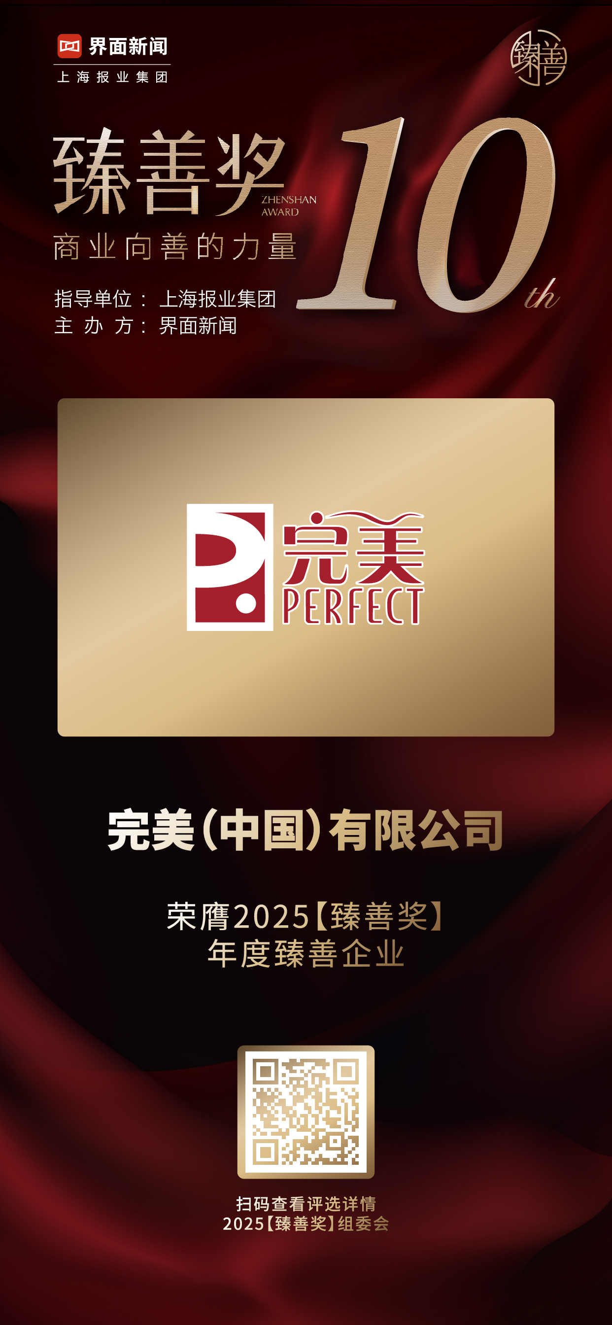 12月16日,上海報(bào)業(yè)集團(tuán) | 界面新聞在上海阿納迪酒店舉辦了2025【臻善獎(jiǎng)】頒獎(jiǎng)典禮,并正式公布了本年度獲獎(jiǎng)名單。聚“商業(yè)向善”之力,本屆【臻善獎(jiǎng)】吸引了眾多在公益慈善領(lǐng)域有所貢獻(xiàn)的優(yōu)秀企業(yè)和公益人士參與。其中,完美(中國)有限公司(簡(jiǎn)稱“完美公司”)榮獲“2025【臻善獎(jiǎng)】年度臻善企業(yè)”。