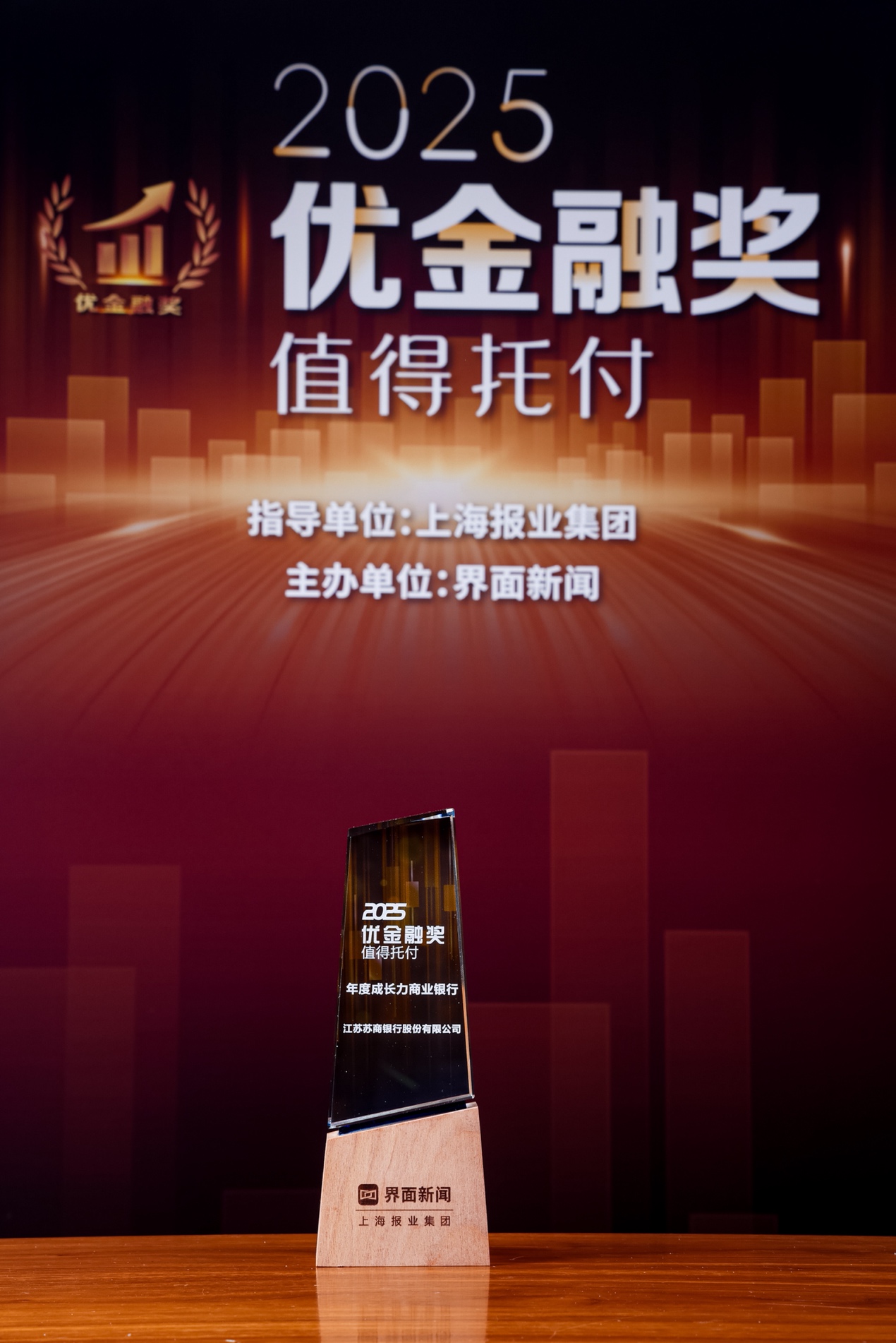 12月16日,由上海報(bào)業(yè)集團(tuán)旗下界面新聞主辦的“2025界面財(cái)經(jīng)年會(huì)暨‘優(yōu)金融獎(jiǎng)’頒獎(jiǎng)典禮”在上海圓滿落幕。本次年會(huì)以“擁抱變革 破局共生”為核心主題,匯聚金融與經(jīng)濟(jì)領(lǐng)域?qū)<覍W(xué)者、行業(yè)精英,共探中國(guó)經(jīng)濟(jì)的韌性根基、轉(zhuǎn)型路徑與增長(zhǎng)新范式。作為年會(huì)的核心環(huán)節(jié),“優(yōu)金融獎(jiǎng)”頒獎(jiǎng)典禮聚焦金融業(yè)年度履職表現(xiàn)與行業(yè)引領(lǐng)力,吸引銀行、保險(xiǎn)、證券、金融科技等多領(lǐng)域機(jī)構(gòu)踴躍參與。經(jīng)過(guò)多維度嚴(yán)苛評(píng)選,蘇商銀行憑借卓越的成長(zhǎng)韌性、差異化的數(shù)字普惠實(shí)踐及扎實(shí)的經(jīng)營(yíng)成效,成功摘得2025“優(yōu)金融獎(jiǎng)”年度成長(zhǎng)力商業(yè)銀行殊榮。