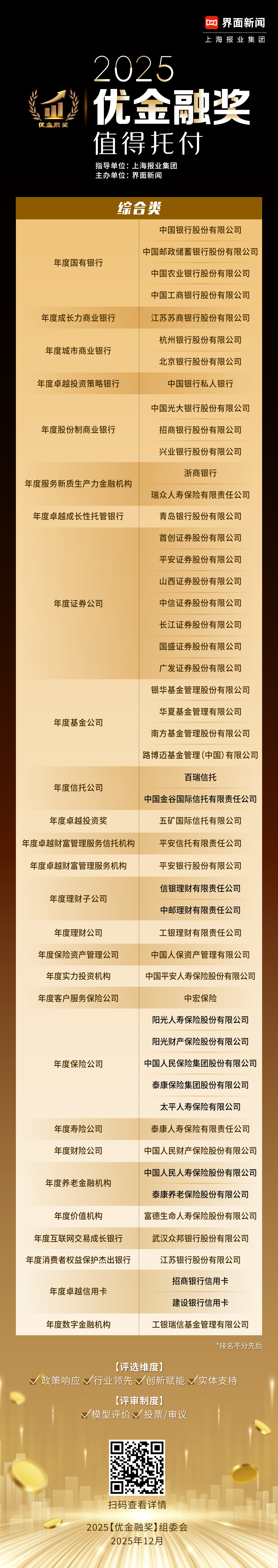 12月16日,由上海報業(yè)集團|界面新聞發(fā)起的2025【優(yōu)金融獎】評選在上海阿納迪酒店舉辦的2025【界面財經(jīng)年會】上正式公布獲獎名單。近70家金融機構(gòu)與企業(yè),憑借其本年度的優(yōu)異表現(xiàn),獲得本次年度大獎。頒獎典禮上,來自銀行、保險、證券基金、信托、資管、金融科技等領域的多家知名機構(gòu)與企業(yè)共同見證了榮譽的誕生。