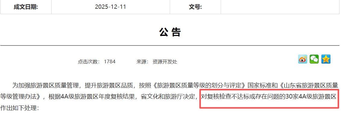 12月11日,山東省文化和旅游廳網(wǎng)站連發(fā)兩條公示公告,在對(duì)15家旅游景區(qū)擬升格為國(guó)家4A級(jí)旅游景區(qū)(以下簡(jiǎn)稱“4A級(jí)景區(qū)”)進(jìn)行公示的同時(shí),也對(duì)復(fù)核檢查不達(dá)標(biāo)或存在問(wèn)題的30家4A級(jí)景區(qū)作出處理。