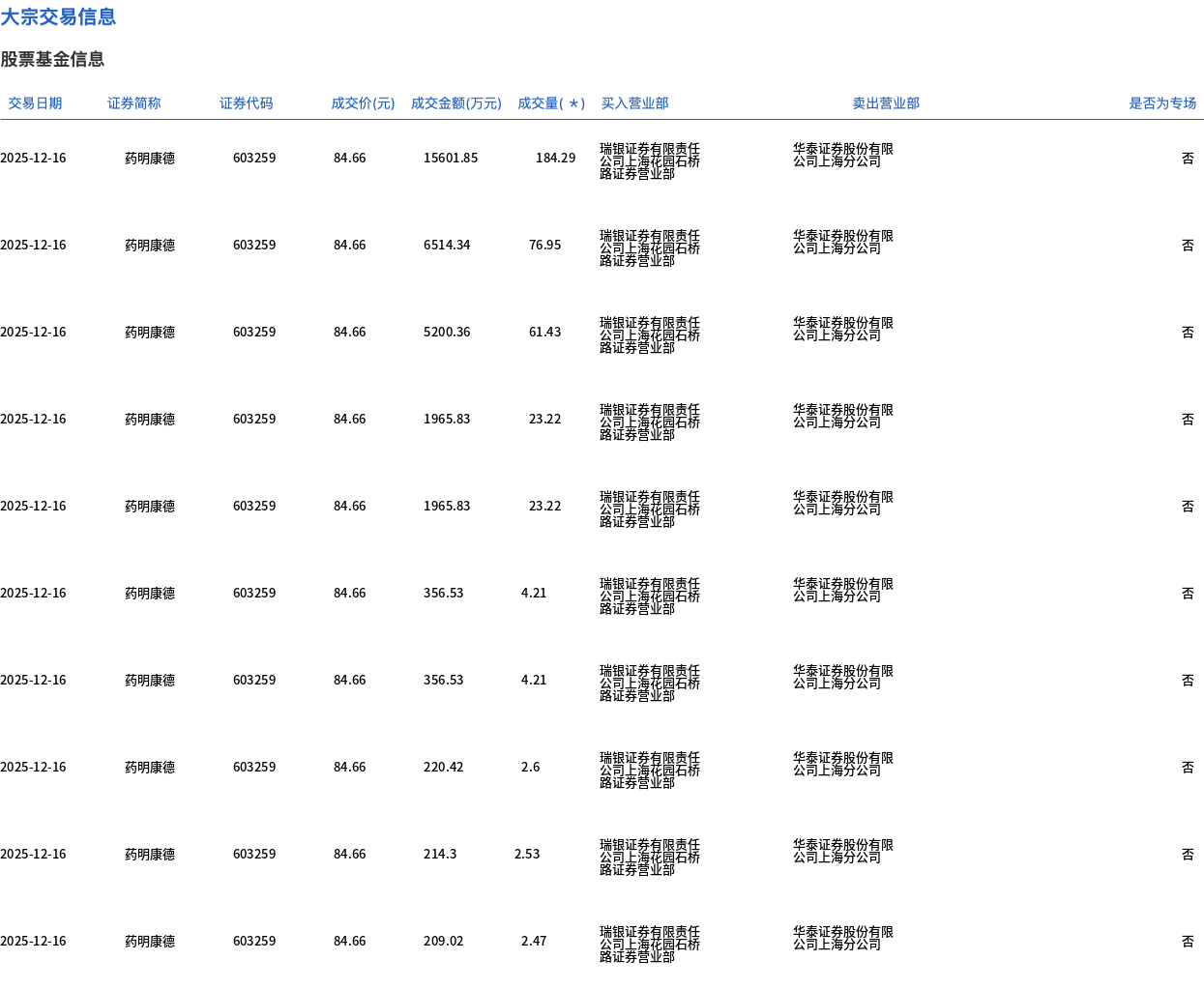 12月16日,藥明康德大宗交易成交385.13萬股,成交額3.26億元,占當(dāng)日總成交額的11.47%,成交價84.66元,較市場收盤價89.12元折價5%。