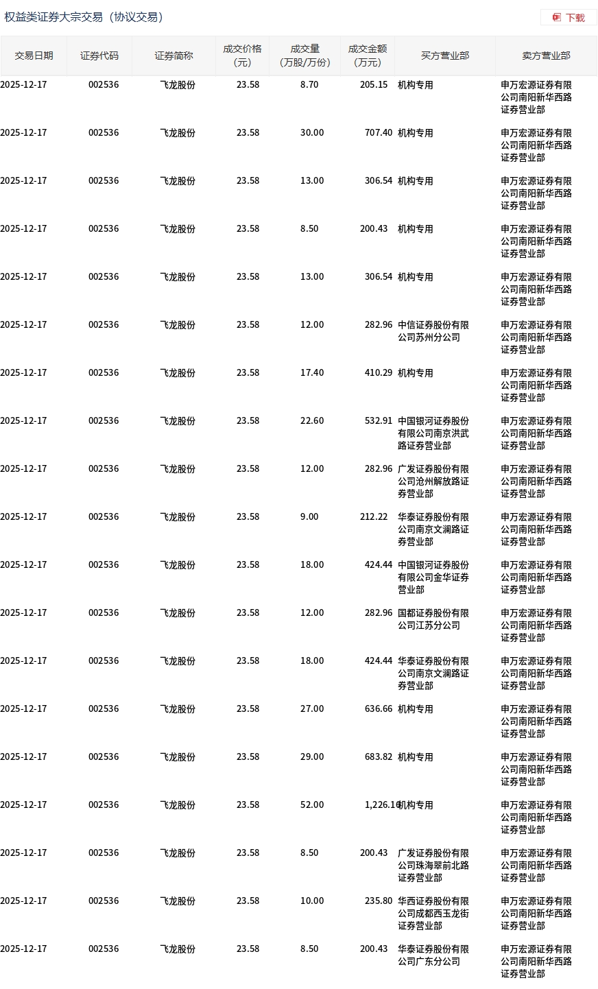 12月17日,飛龍股份大宗交易成交329.2萬股,成交額7762.54萬元,占當(dāng)日總成交額的11.72%,成交價(jià)23.58元,較市場(chǎng)收盤價(jià)27.59元折價(jià)14.53%。