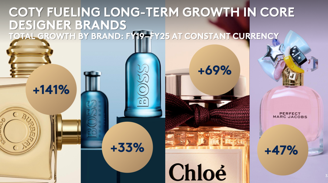 從對(duì)奢侈品牌彩香業(yè)務(wù)的運(yùn)營(yíng)成績(jī)來看,科蒂的成績(jī)依然顯著。根據(jù)科蒂的披露,2019財(cái)年至2025財(cái)年(按固定匯率計(jì)算),Burberry業(yè)務(wù)增長(zhǎng)141%,Hugo Boss業(yè)務(wù)增長(zhǎng) 33%,Chloé業(yè)務(wù)增長(zhǎng) 69%,Marc Jacobs業(yè)務(wù)增長(zhǎng) 47%,Gucci Beauty業(yè)務(wù)增長(zhǎng)了61%。