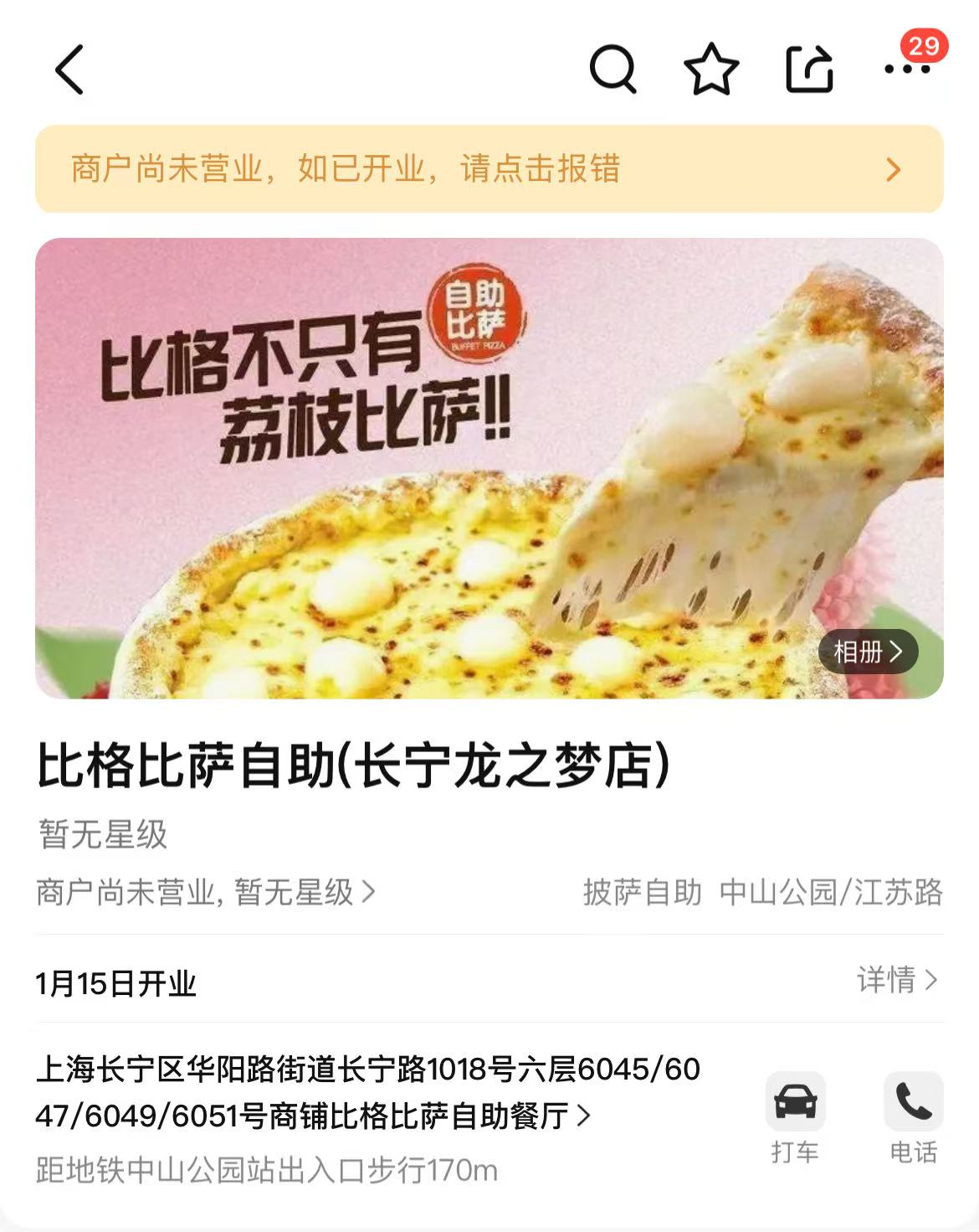 界面新聞獲悉,比格比薩自助要在上海長(zhǎng)寧龍之夢(mèng)開(kāi)店,在大眾點(diǎn)評(píng)該門(mén)店已被收錄,最新顯示將于2026年1月15日開(kāi)業(yè)。比格比薩品牌方對(duì)界面新聞確認(rèn)了這家新店的開(kāi)店計(jì)劃。