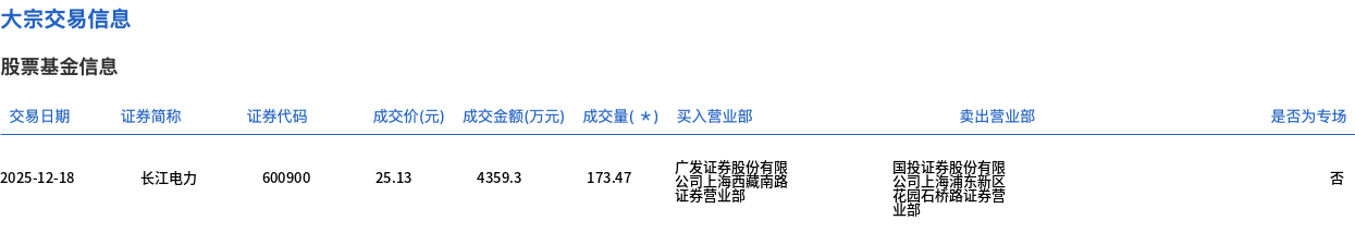 12月18日,長江電力大宗交易成交173.47萬股,成交額4359.3萬元,占當(dāng)日總成交額的3.24%,成交價25.13元,較市場收盤價28.08元折價10.51%。