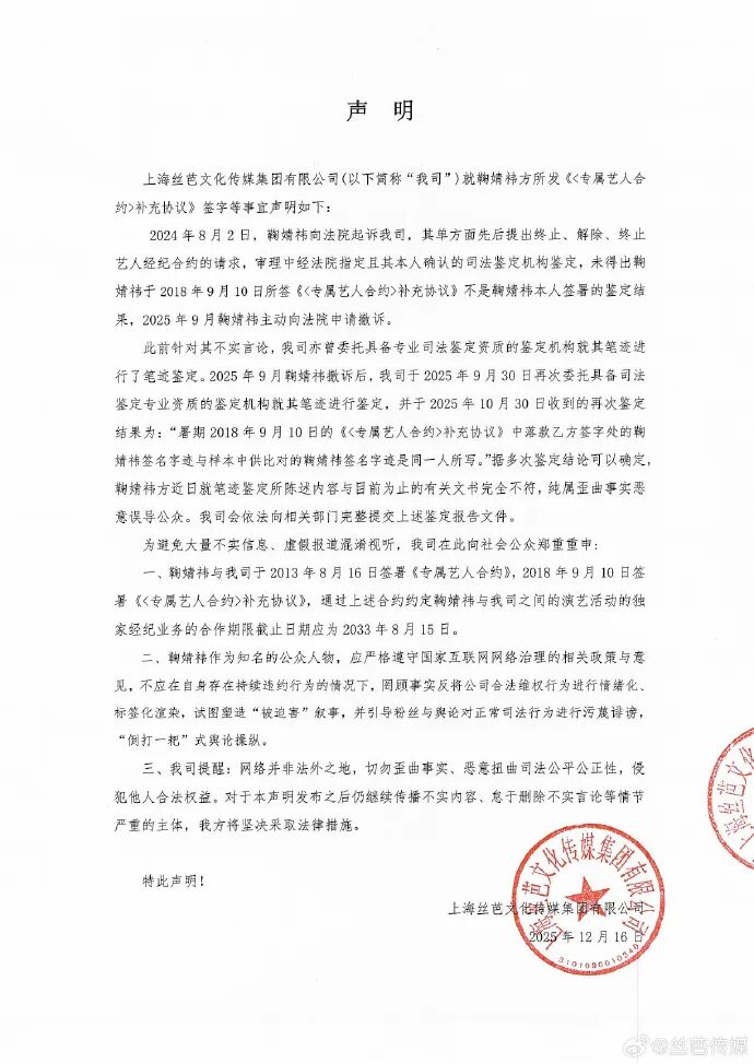 絲芭傳媒隨后作出詳細(xì)回應(yīng),絲芭傳媒表示,公司為鞠婧祎單飛發(fā)展投入巨大,截至2024年5月,已向其結(jié)算支付稅前金額超過1.39億元,并列出包括按月支付固定收入25萬元(稅前)、提供專職司機(jī)、房車及上海高級公寓居住等具體待遇,以此反駁“壓榨”說法。同時,絲芭還曬出自行委托的筆跡鑒定報告,稱相關(guān)協(xié)議簽名為真,否認(rèn)偽造。