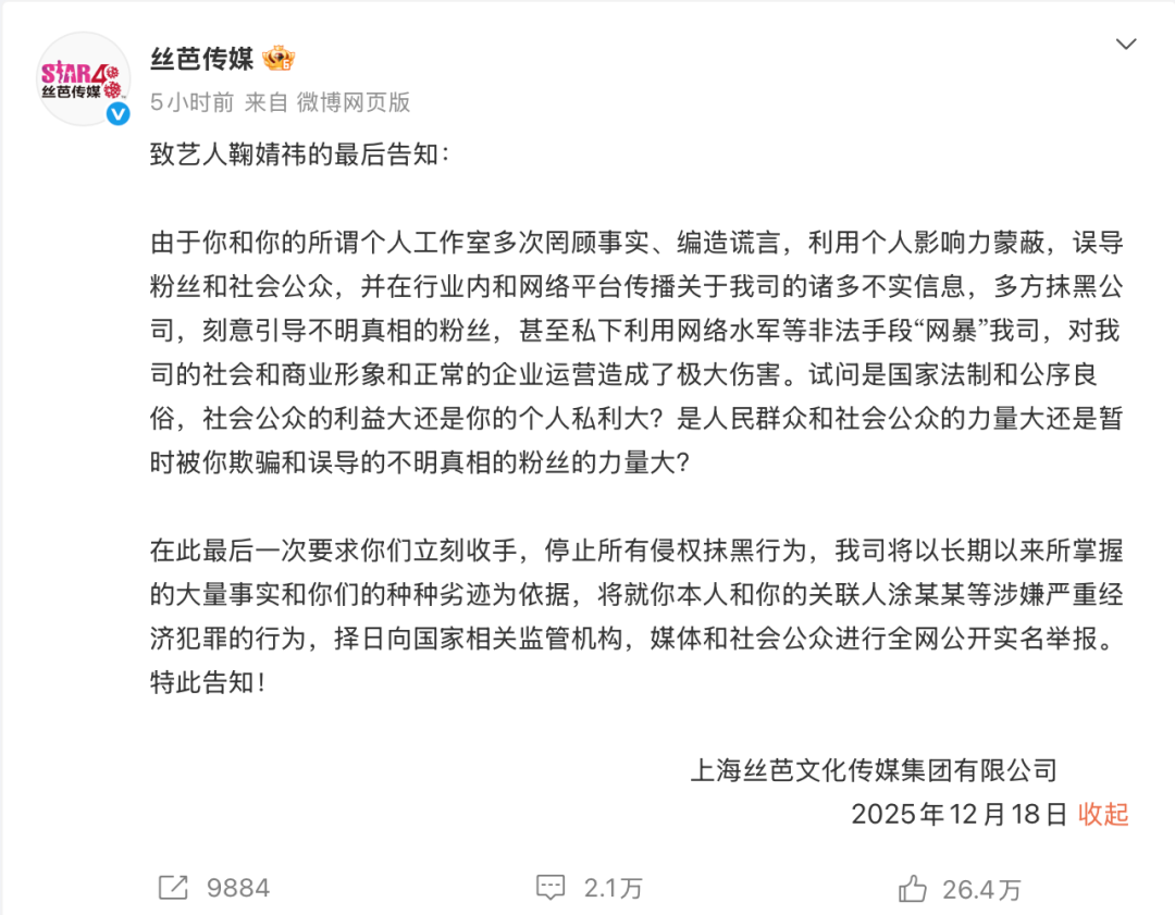 12月18日,絲芭傳媒發(fā)布《最后告知》,措辭嚴(yán)厲,指責(zé)鞠婧祎方編造謊言、誤導(dǎo)公眾并發(fā)起“網(wǎng)絡(luò)暴力”,要求其立即停止所有所謂“侵權(quán)”行為。公司更表示,將擇日實(shí)名舉報鞠婧祎及其關(guān)聯(lián)人涉嫌“嚴(yán)重經(jīng)濟(jì)犯罪”,使得糾紛性質(zhì)驟然嚴(yán)峻。