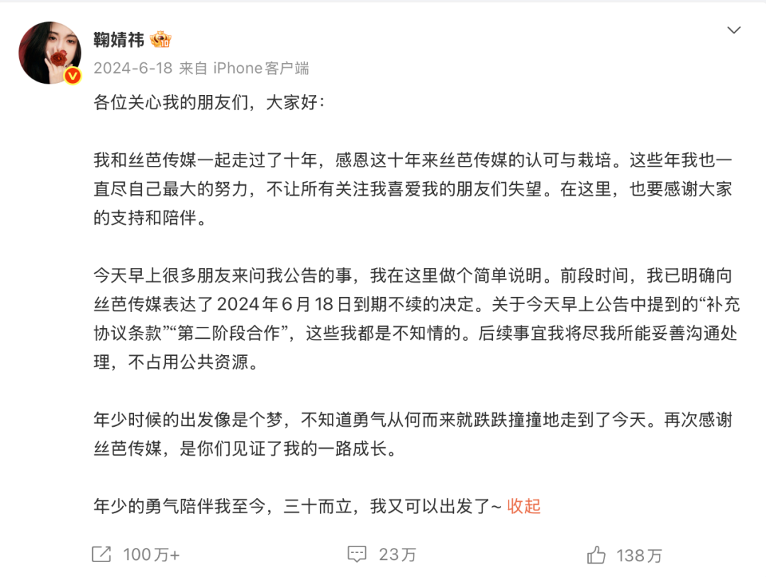 2024年6月18日,絲芭傳媒發(fā)聲明稱,與鞠婧祎已進(jìn)入“第二階段合作協(xié)議”,暗示合約延續(xù)。