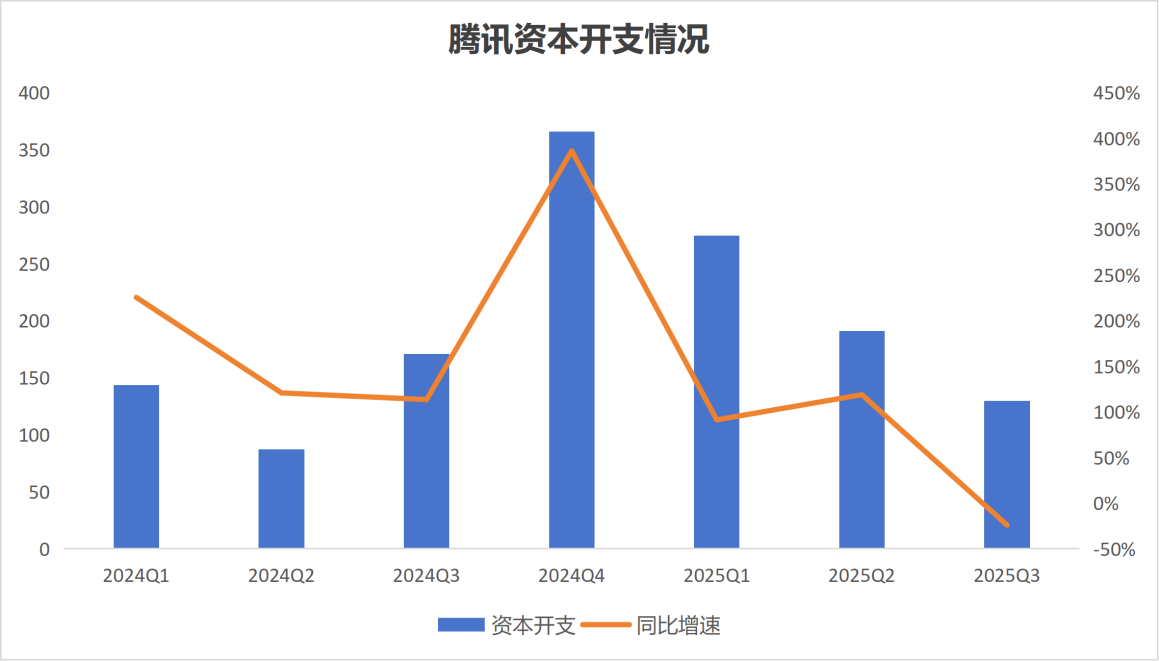 騰訊在去年四季度創(chuàng)下資本開支金額和增速高峰后,今年趨于“冷靜”,資本開支逐季減少,三季度資本開支129.83億元,同比下降24.1%。