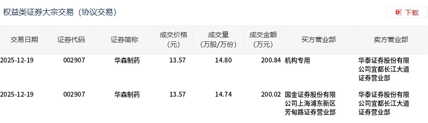 12月19日,華森制藥大宗交易成交29.54萬股,成交額400.86萬元,占當(dāng)日總成交額的15.82%,成交價13.57元,較市場收盤價15.21元折價10.78%。