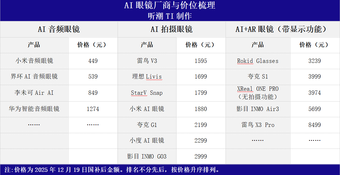 當(dāng)前市面上的AI眼鏡品類繁多,定價(jià)跨度極大,從數(shù)百元到數(shù)千元不等,主要的原因也正是在于產(chǎn)品形態(tài)的差異化定位。而在這場(chǎng)混戰(zhàn)中,并非所有玩家都站在同一起跑線。目前國(guó)內(nèi)可清晰劃分為以下五類競(jìng)爭(zhēng)者: